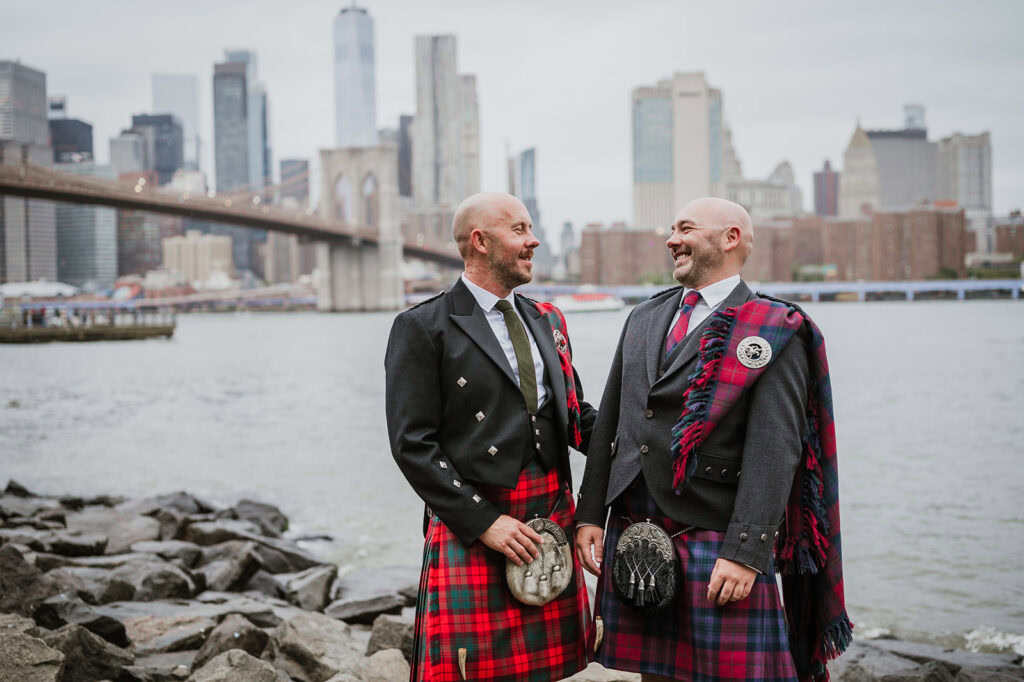 Iain & Johnny: went all-in Brooklyn fall textures – cobblestones, murals, waterfront – and a vintage taxi to tie it together (while wearing kilts and tartans!)